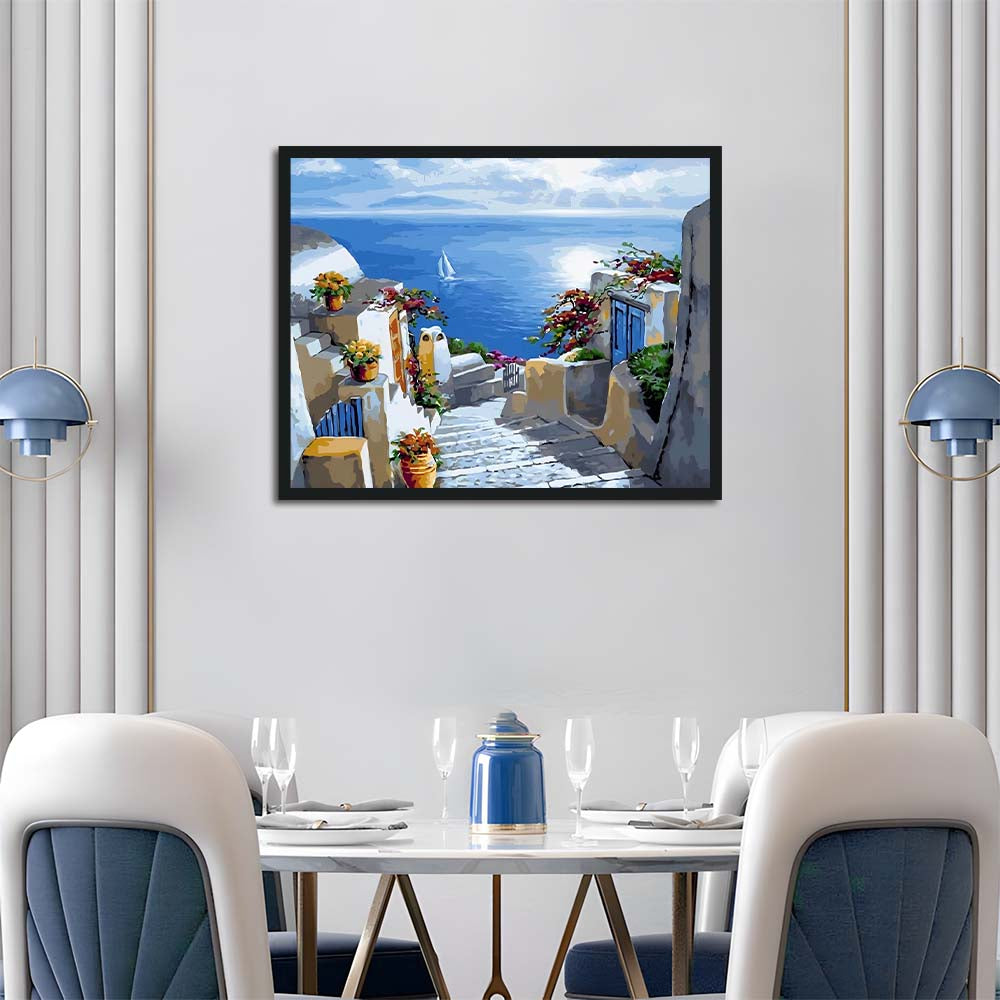 Colorful Cliffside Houses Overlook Blue Sea Cross Stitch Kits