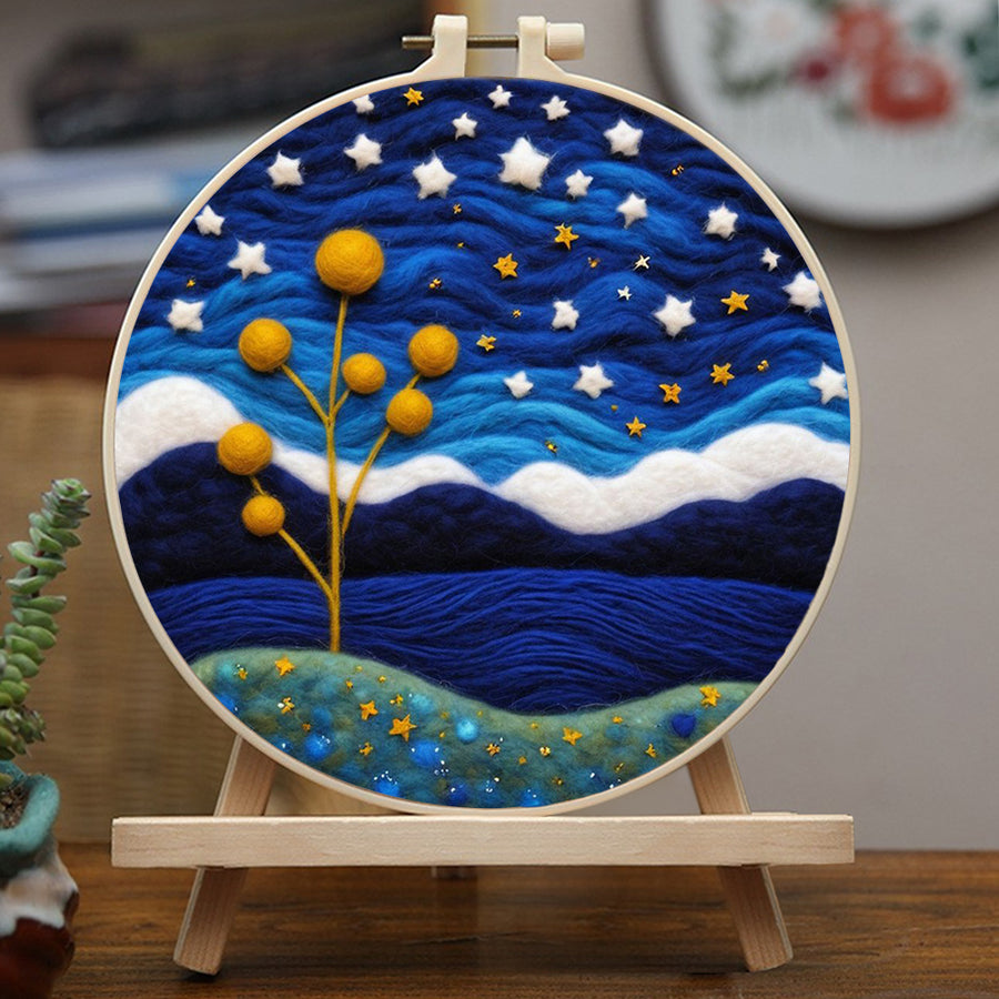 Stars and Yellow Tree Under Sky Wool Needle Felting Painting Kit