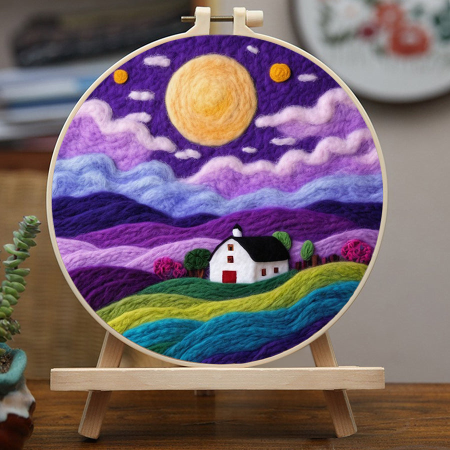 Yellow Moon Glows Behind Purple Cottage Wool Needle Felting Painting Kit